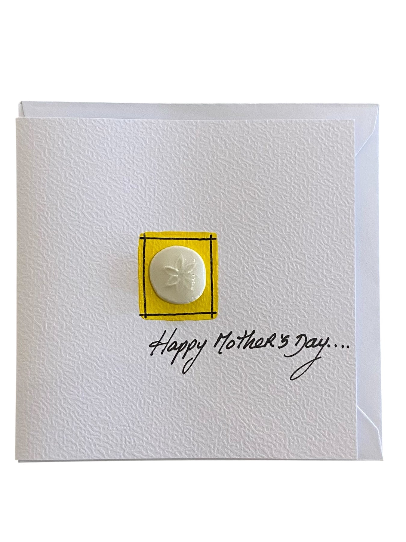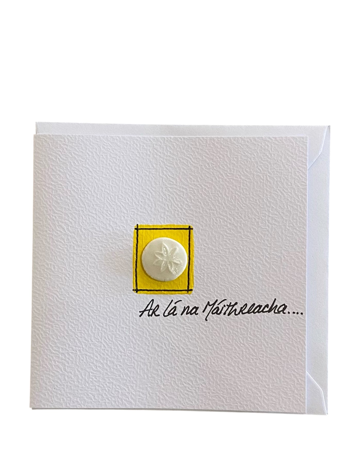 The card is 4"x4" textured card, with a small porcelain symbol relief on the front, the script is hand written by Linda Ní hAiniféin of Dingle Ceramics.
